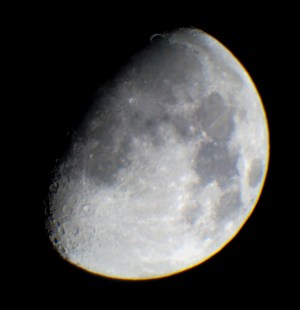 Wir haben auch unseren Mond beobachtet. Die Forscher haben herausgefunden, dass der Mond gar nicht so staubtrocken ist, wie man früher dachte. Auch auf dem Mond gibt es Wasser, nämlich insbesondere in tiefen Kratern an den Mondpolen. Mit einer kleinen Kamera und dem Sternwartenteleskop haben wir ein Foto vom Mond machen können.