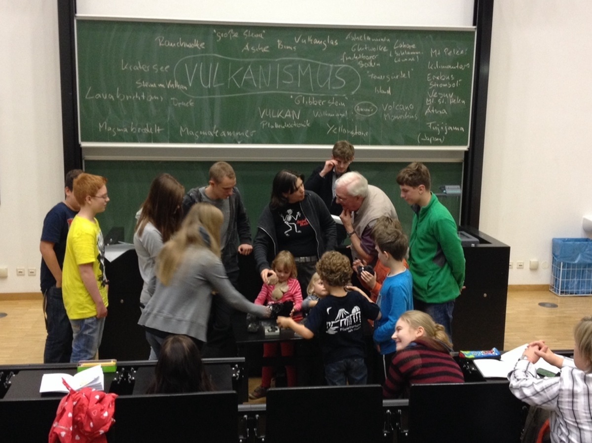 Zwei Geologen vom Institut für Geowissenschaften haben vor den kleinen und größeren ASTROlinos einen tollen Vortrag zum Thema Vulkanismus gehalten. Alle ASTROlinos haben aufmerksam zugehört und viel über die unterschiedlichen Vulkantypen erfahren. Erstaunlich viele Vulkannamen hat das Publikum zusammengetragen und sich Vulkangesteine angeschaut.