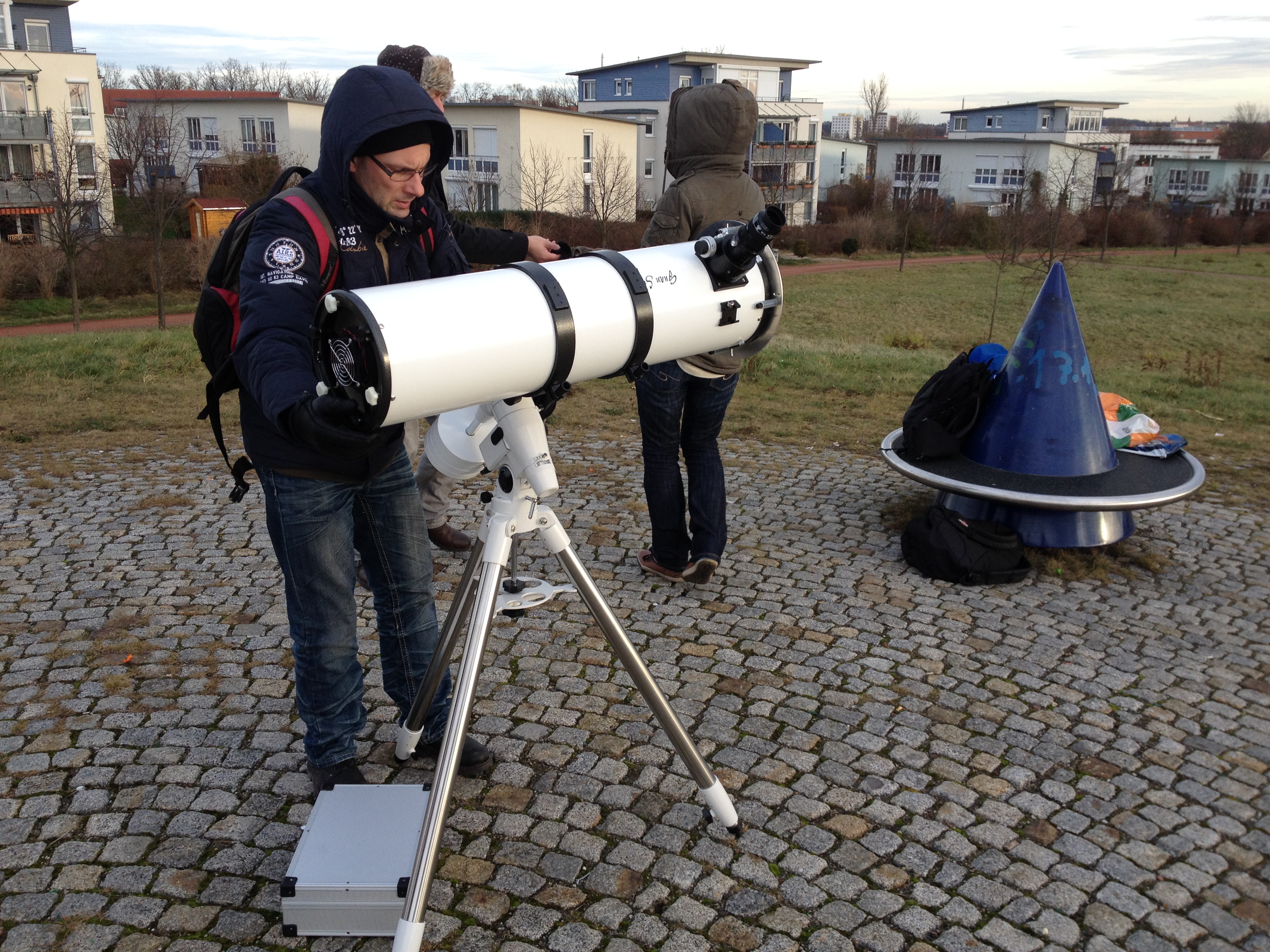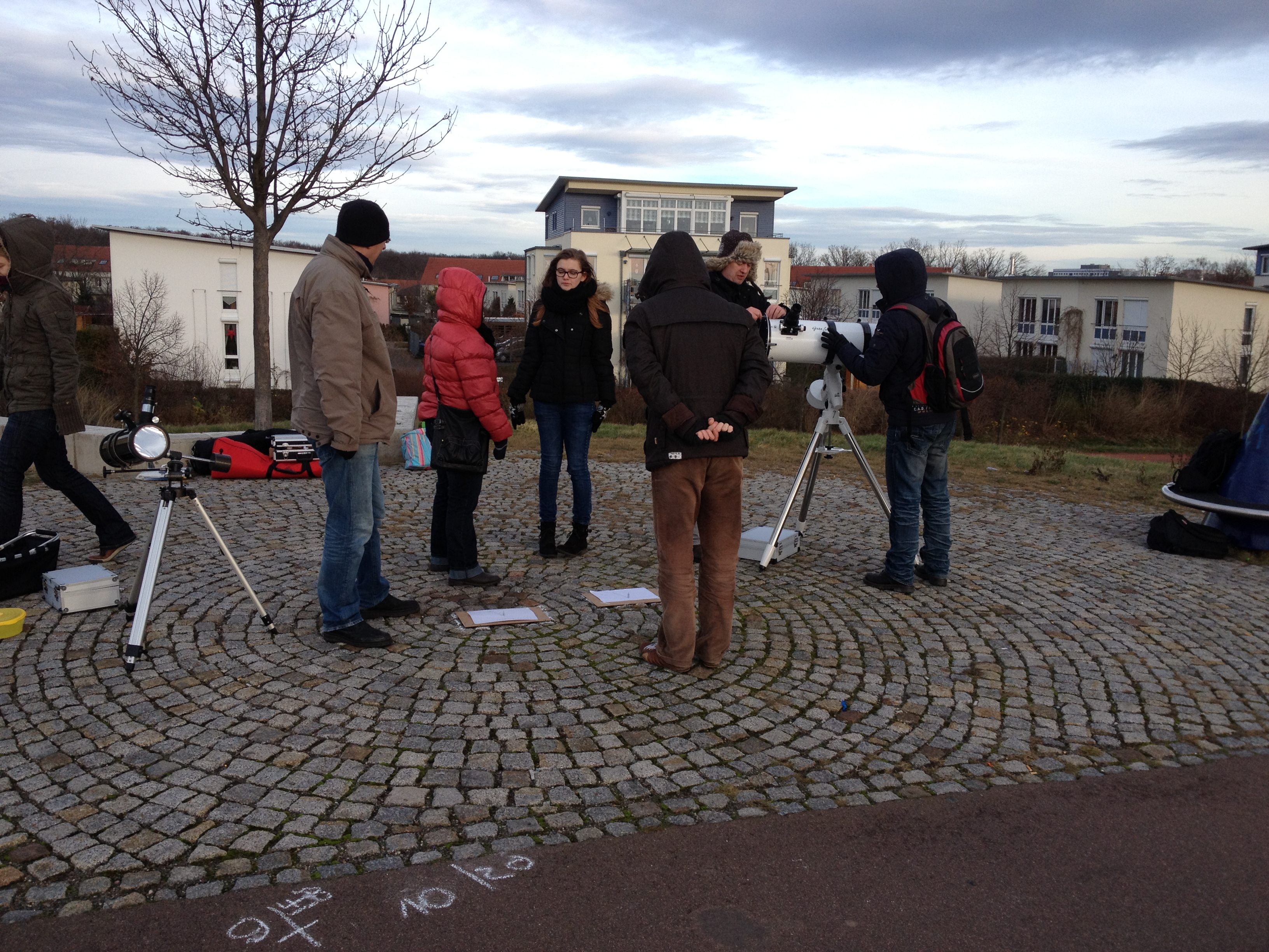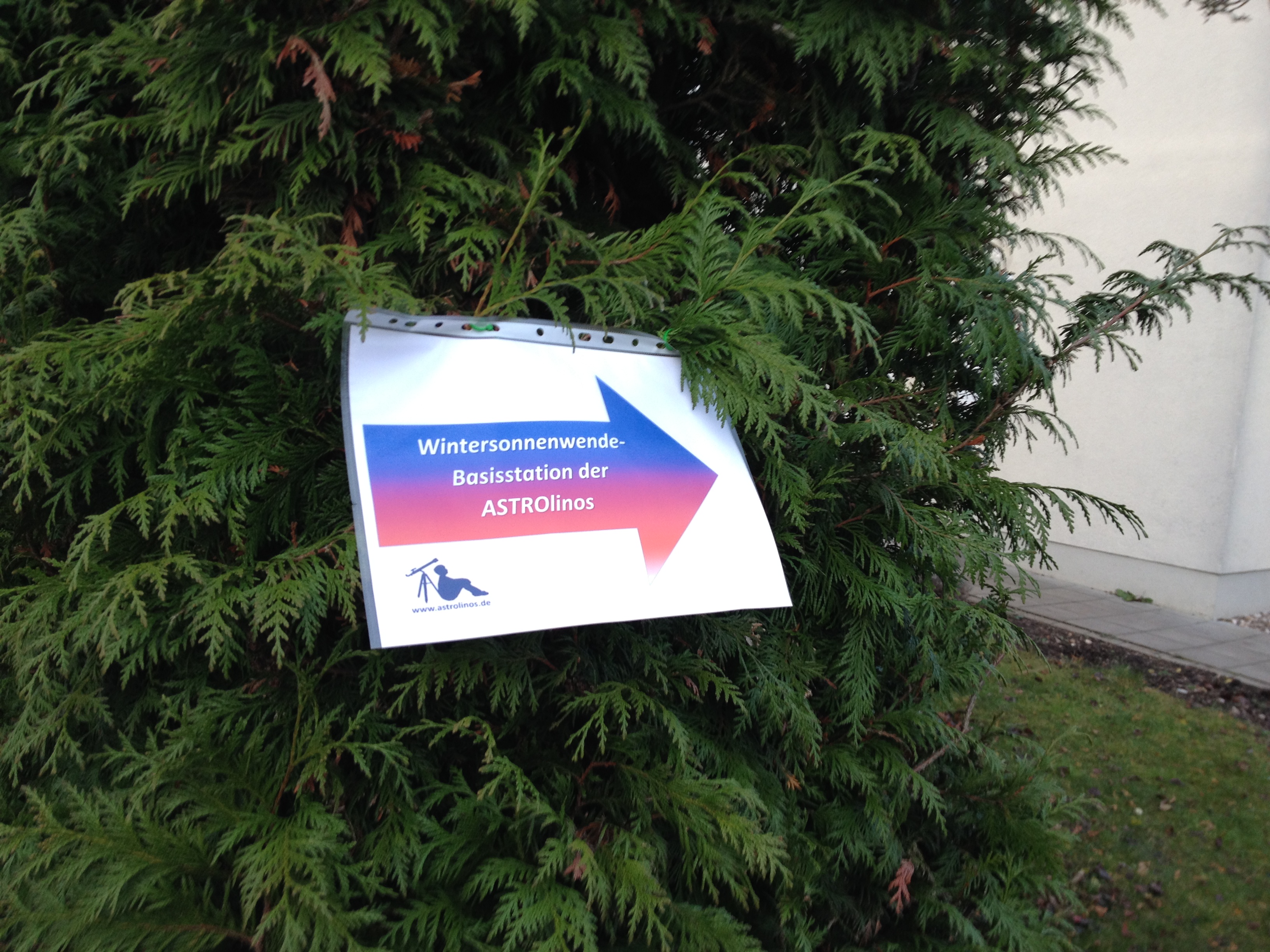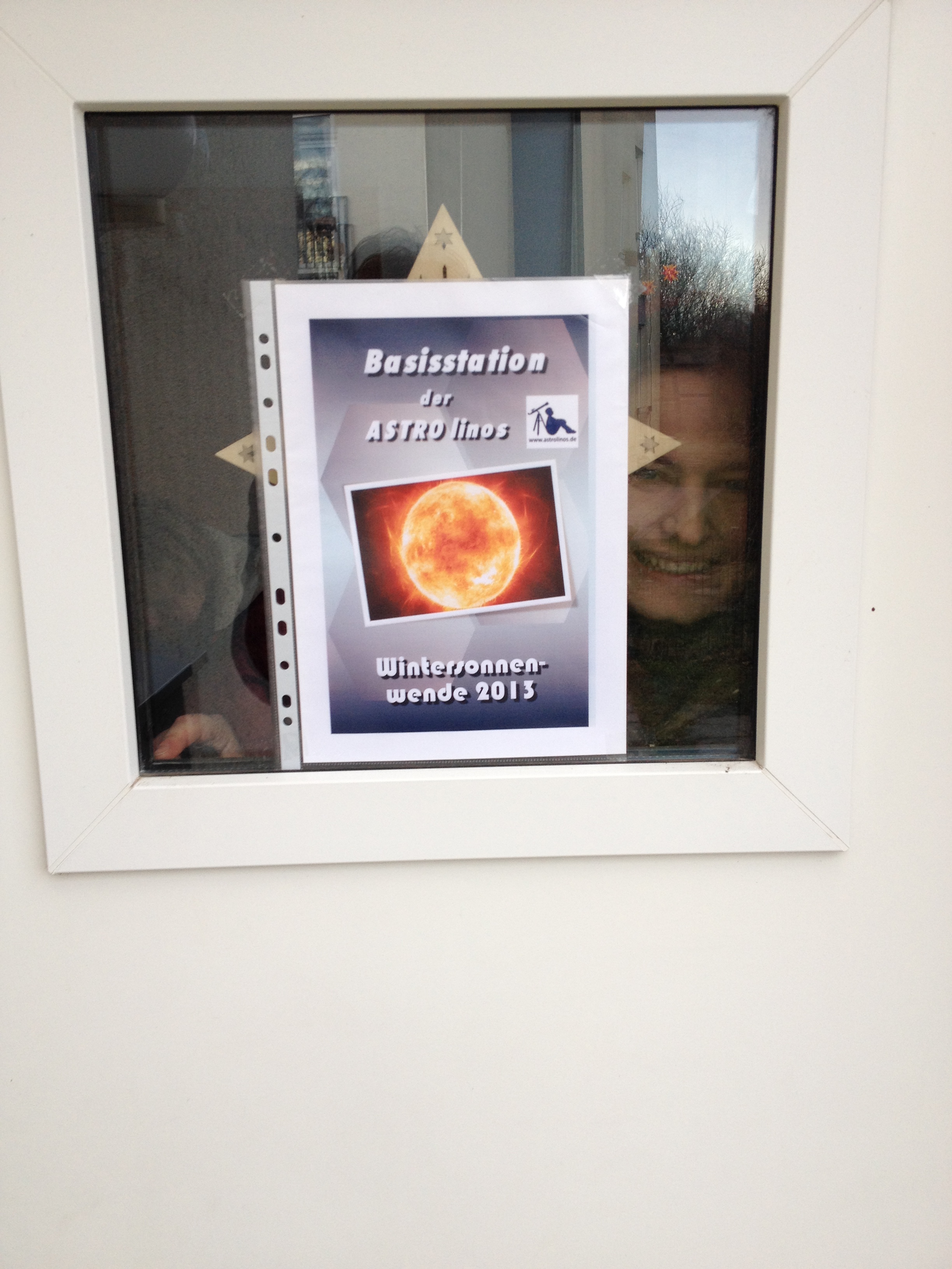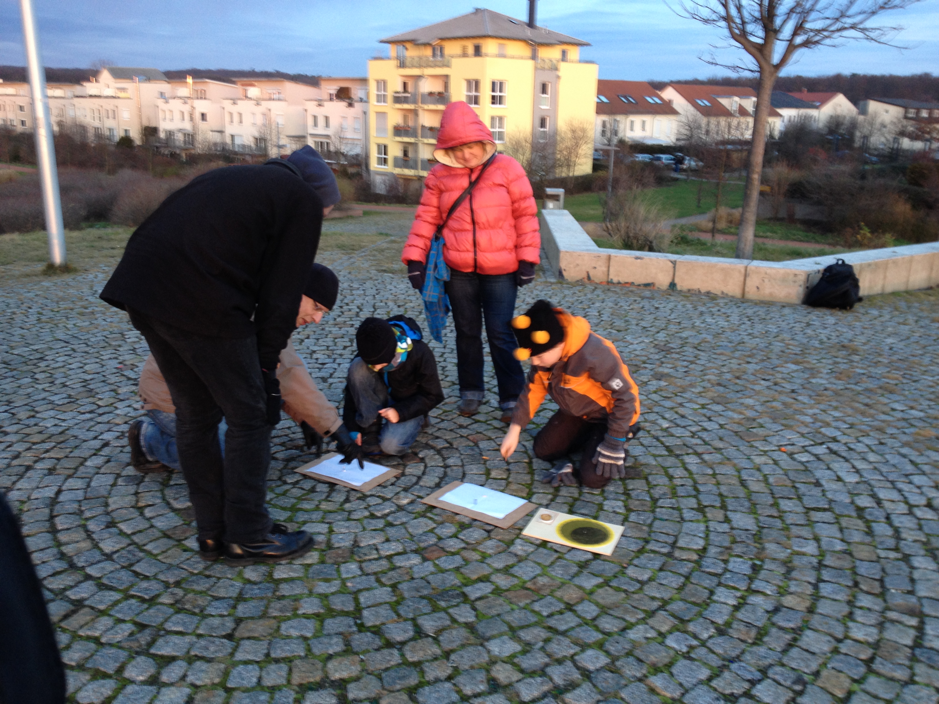 Kurz vor Weihnachten haben sich die ASTROlinos auf dem Berg am Wasserspielplatz getroffen, um den Sonnenstand über einige Stunden hinweg zu verfolgen. Dies ist eine Aufgabe des Wettbewerbs zur Sonnenbeobachtung, die wir erfüllen müssen. Also sind die ASTROlinos (und deren BetreuerInnen) am 21. Dezember super zeitig aufgestanden, um sich pünktlich 7:30 Uhr zu treffen, schließlich sollte die Sonne um 8:13 Uhr MEZ aufgehen. Dafür wurden wir auch mit einem sehr schönen Sonnenaufgang belohnt. Bis der erste lange Schatten auf unseren Arbeitsblättern zu sehen war, sollte allerdings noch deutlich mehr Zeit vergehen. Leider war die Sonne häufig von Wolken bedeckt und ein kalter Wind lies die Sonnenbeobachtung eher an eine Polarexpedition erinnern. Gut, dass wir in der Nähe eine ASTROlino-Basisstation hatten, welche unsere ASTROlino-Eltern zur Verfügung stellten. Hier konnten wir uns aufwärmen. Natürlich haben wir auch besprochen, was es denn überhaupt mit der Wintersonnenwende so auf sich hat.