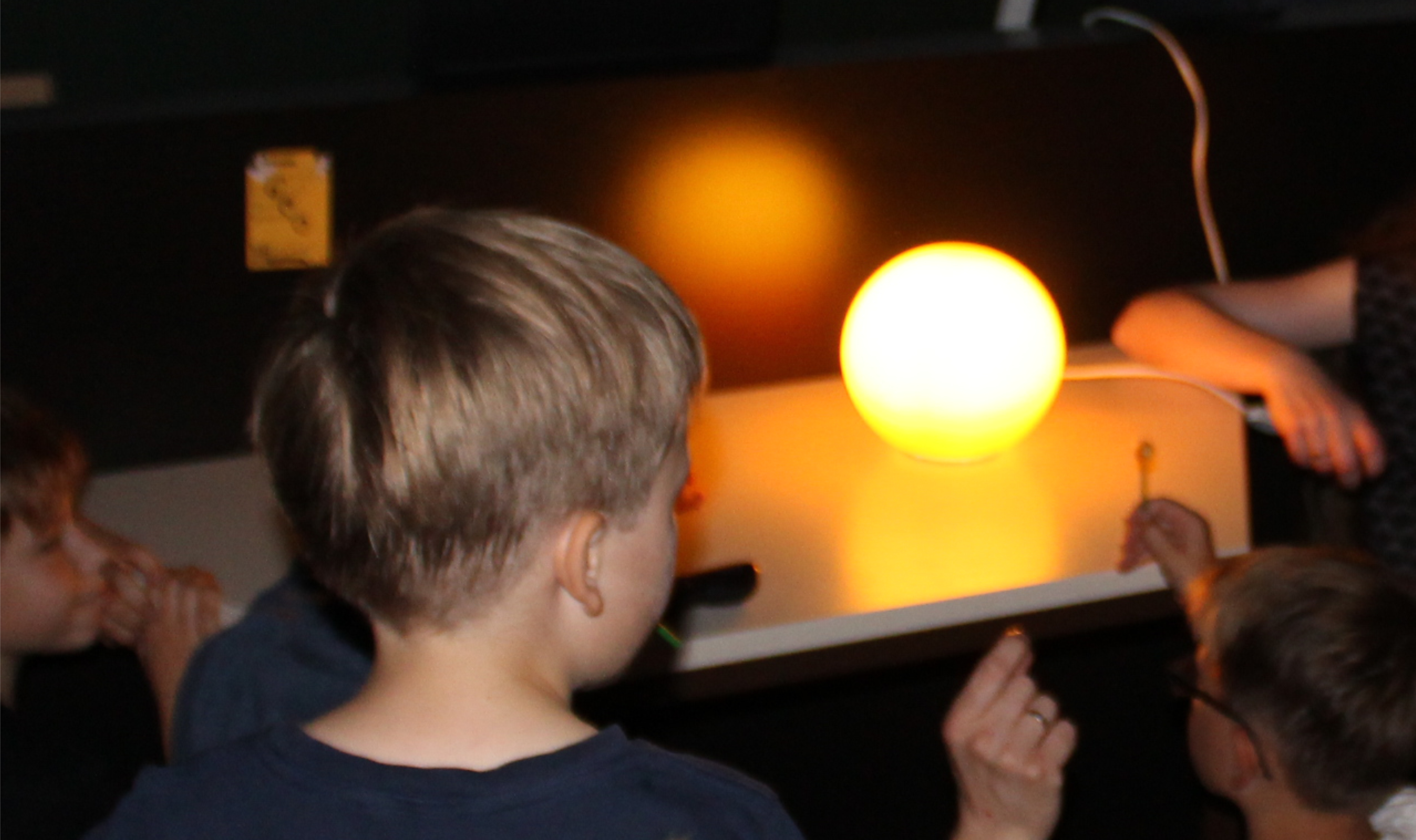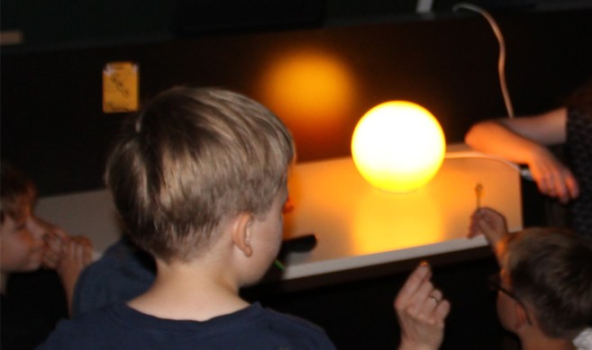 Inga und Dirk Schlesier von den ASTROlinos erklären Kindern anschaulich und kindgerecht, wie es zu einer vollständigen Verfinsterung der Sonne kommen kann, da doch der Mond eigentlich viel kleiner ist als die Sonne. Außerdem geben die Beiden einen Ausblick wann und wo wir in Deutschland und in Halle mit der nächsten Totalen Sonnenfinsternis rechnen können.