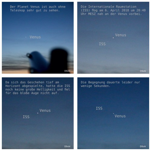 Natürlich ist die Internationale Raumstation (ISS) nicht zur Venus und dann auch noch an ihr vorbei geflogen. Vielmehr sind sich die beiden Himmelskörper – ISS und Venus – am Abendhimmel und damit scheinbar recht nahe gekommen. In unserer SternGuckerZeit für Alle am 6. April haben wir während der Präsentation bemerkt, dass es später am selbigen Abend diese Begegnung geben wird. Motiviert haben dann die großen Sterngucker nach diesem Ereignis Ausschau gehalten. Leider war die Helligkeit der ISS eher enttäuschend, was man aber aufgrund der absehbaren Horizontnähe hätte ahnen können. Dennoch haben unsere Kameras das Ereignis festhalten können und es kam nun die bisher ungelöste Frage auf: „Kann die ISS auch vor der Venus vorbei fliegen (ein „ISS-Transit“ vor der Venus) und wenn ja, wo und wann kann man dieses Ereignis beobachten. Um diese Frage zu beantworten, müssen noch Hausaufgaben gemacht werden 🙂