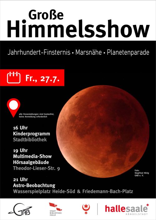 Am 27.7. fallen mit einer Totalen Mondfinsternis und einer besonderen Marsopposition zwei sehenswerte Himmelsereignisse zusammen. Außerdem sind mehrere Planeten am sommerlichen Abend- und Nachthimmel zu sehen. Wir sind dabei, wenn die Entstehung und der Ablauf der Himmelsereignisse erklärt und bei hoffentlich klarem Himmel die Ereignisse mit Teleskopen beobachtet werden.