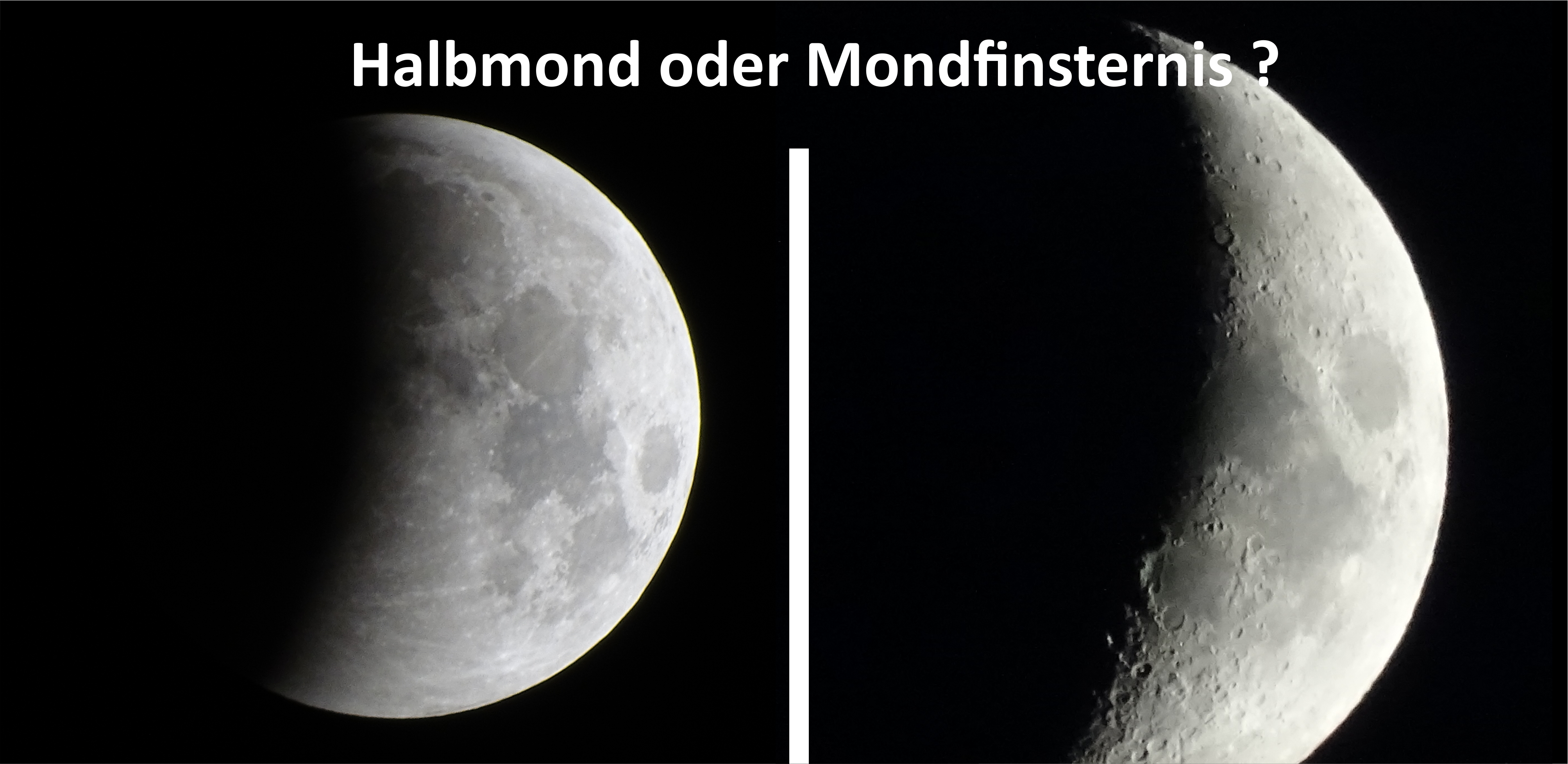 Die Eltern von zwei unserer ASTROlinos haben unseren Mond fotografiert, als er teilweise verfinstert war. Sie haben an einem anderen Tag auch ein Foto eines Halbmondes gemacht. Kann man eigentlich unterscheiden, welcher Mond auf dem Bild durch die Verfinsterung zum Halbmond wurde?