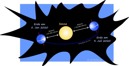 Am 5. Januar hat die Erde ihren geringsten Abstand zu unserer Sonne. Dies kommt dadurch, dass die Erdbahn und die Sonne kein perfekter Kreis ist, sondern eine schwache Ellipse. So ist die Erde im Januar der Sonne näher als im Juli. Am 4. Juli erreicht die Erde ihr so genanntes Aphel, also den größten Abstand zur Sonne. Dass wir jetzt Winter haben, liegt also nicht am Abstand zwischen Sonne und Erde sondern allein an der Neigung der Erdachse.