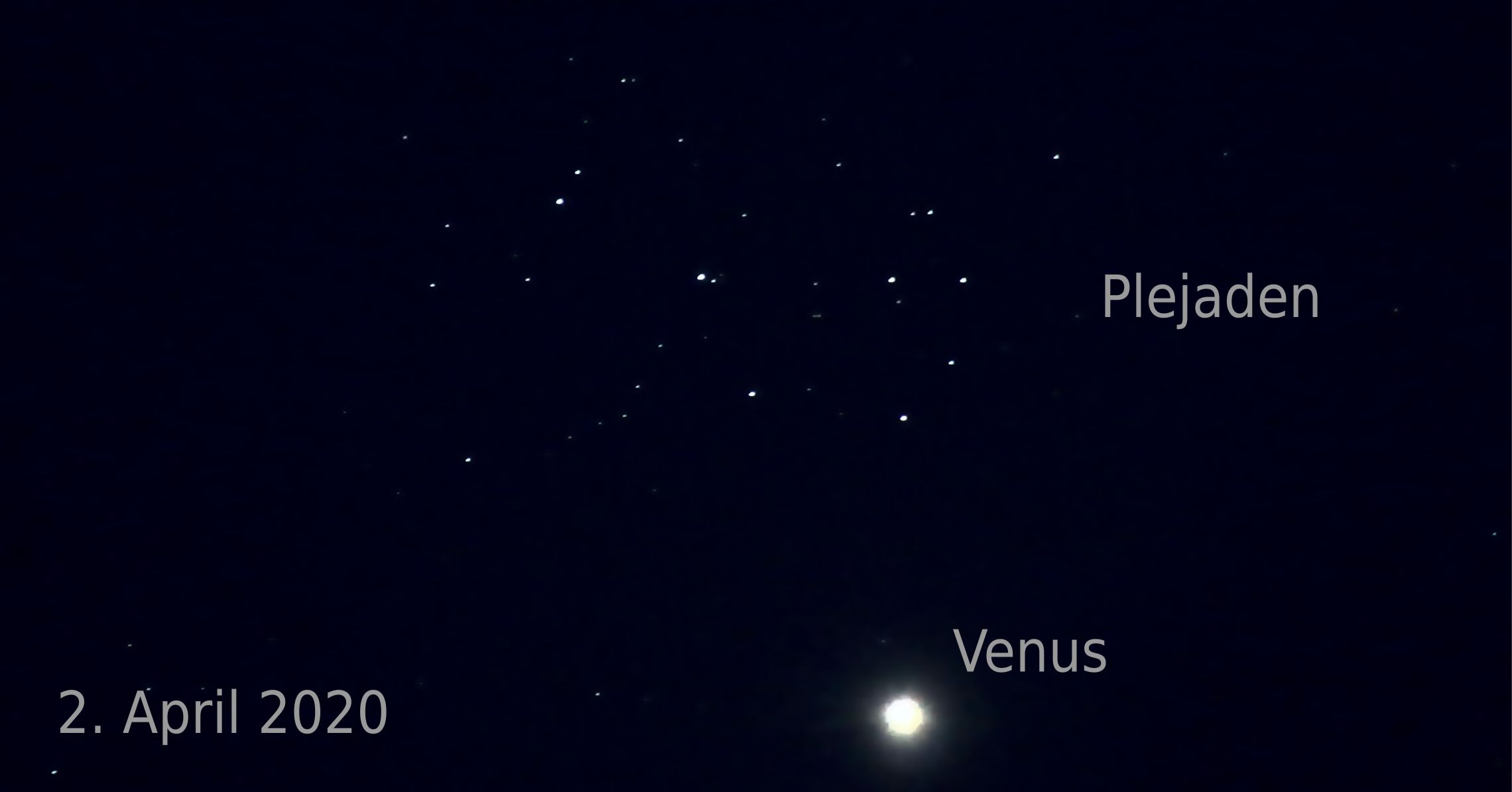Der Planet Venus ist momentan am Abendhimmel gut zu beobachten. Sie ist sehr hell und steht noch einige Zeit nach Sonnenuntergang über dem westlichen Horizont. Sie wandert vor dem Hintergrund der Fixsterne entlang und wird am 3. April an den Plejaden – einer großen Ansammlung von hellen Sternen – vorbeiziehen. Das ergibt für uns auf der Erde einen sehr schönen Anblick, auch wenn sich die Gestirne nicht wirklich nahekommen. Denn die Plejaden, die oftmals auch das Siebengestirn genannt werden, sind mehrere hundert Lichtjahre entfernt. Das Licht der Plejadensterne benötigt etwa 400 Jahre bis zu uns. Das reflektierte Sonnenlicht von der Venus braucht gerade einmal etwas mehr als 5 Minuten! Mit einem Fernglas kann man die Begegnung von Venus und den Plejaden sehr schön sehen. Schon am 4. April ist der Abstand der Venus zu den Plejaden deutlich größer. Das Foto von der Venus und den Plejaden wurde am 2.4. gemacht. Schaut doch mal, wo die Venus am 3., 4. und 5. April steht.