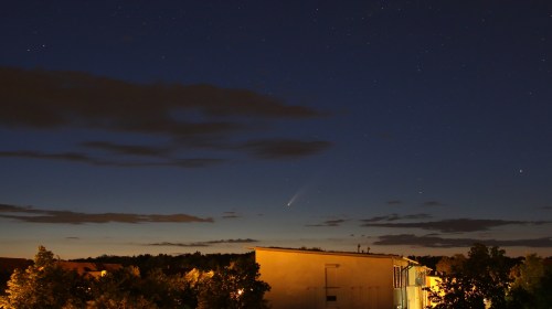 Seit vielen Jahren ist erstmals wieder ein Komet gut mit bloßen Augen am Himmel zu entdecken. Es ist der Komet C/2020 F3 NEOWISE. Aktuell ist er die gesamte Nacht über zu sehen, allerdings stets tief am nördlichen Horizont und abends muss man sich bis etwa 23 Uhr gedulden. Erst dann ist die Dämmerung weit genug voran geschritten, so dass er sich vor dem Himmelshintergrund abhebt und man ihn gut sehen kann. Die Tage sind immer noch sehr lang und es dauert seine Zeit, bis es ausreichend dunkel geworden ist.