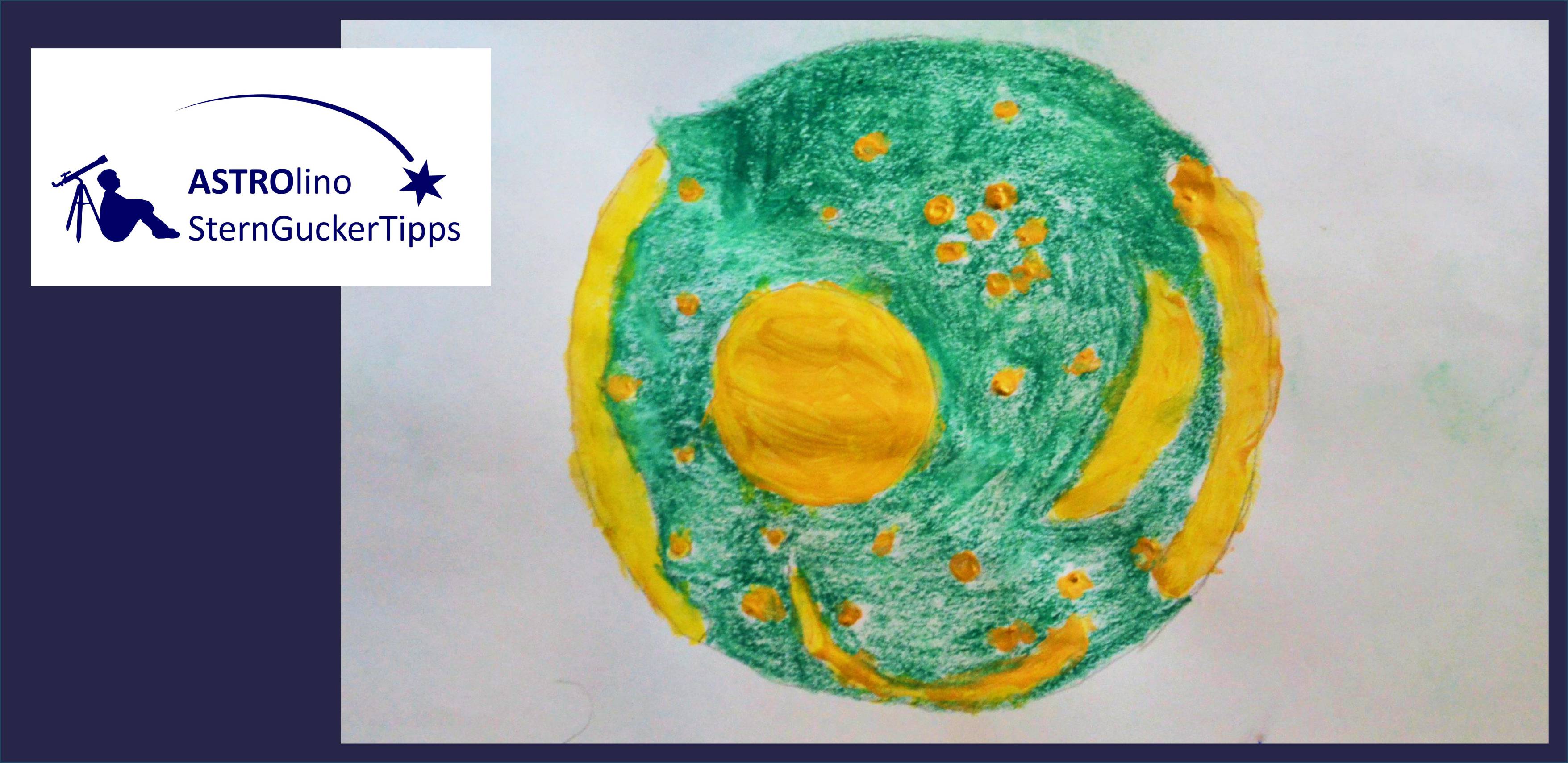 Die Plejaden sind auch auf der Himmelsscheibe dargestellt. Max hat uns das Siebengestirn auf der Himmelsscheibe gemalt. Hier wird der Sternhaufen noch von weiteren Sternen und dem Mond umgeben.