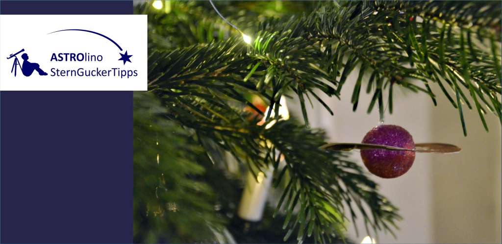 ASTROlino Max hat für euch auch noch einen Basteltipp für den Weihnachtsbaum. Seinen astronomischen Baumschmuck hat er aus einem Flummi gebastelt, an dem ein ausgeschnittener Ring mit Draht befestigt wurde.