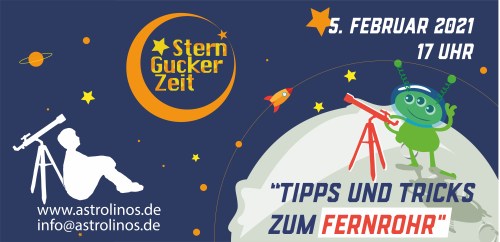 In der SternGuckerZeit, am 5. Februar um 17 Uhr geht es um ein beliebtes Hilfsmittel, welches man für die Beobachtung von Sternen und anderen Himmelsobjekten einsetzt – das Fernrohr. Vielleicht konntet ihr schon einmal durch ein Fernrohr blicken oder habt ein Fernrohr sogar zuhause? Wenn nicht, kein Problem😉 Wir schauen uns an, wie so ein Fernrohr überhaupt aussieht, wie es aufgebaut wird und was man mit und ohne Fernrohr am Sternhimmel alles sehen kann.